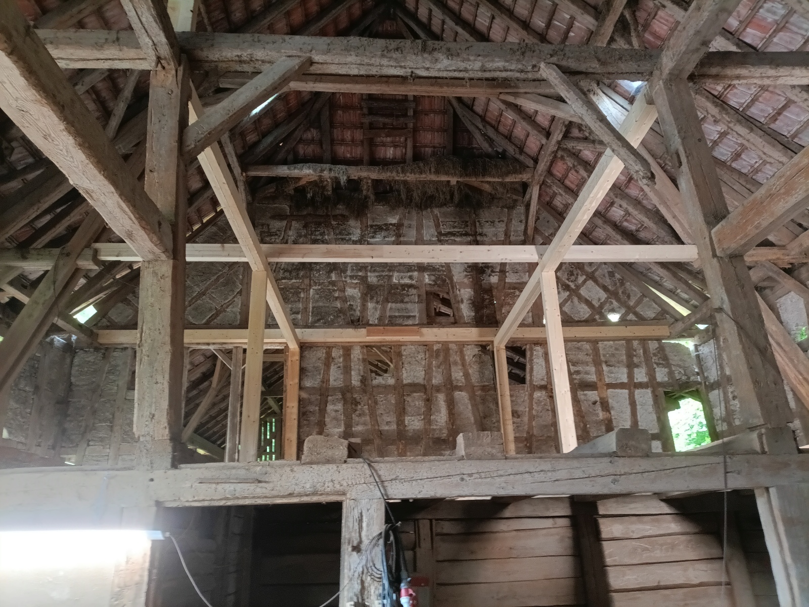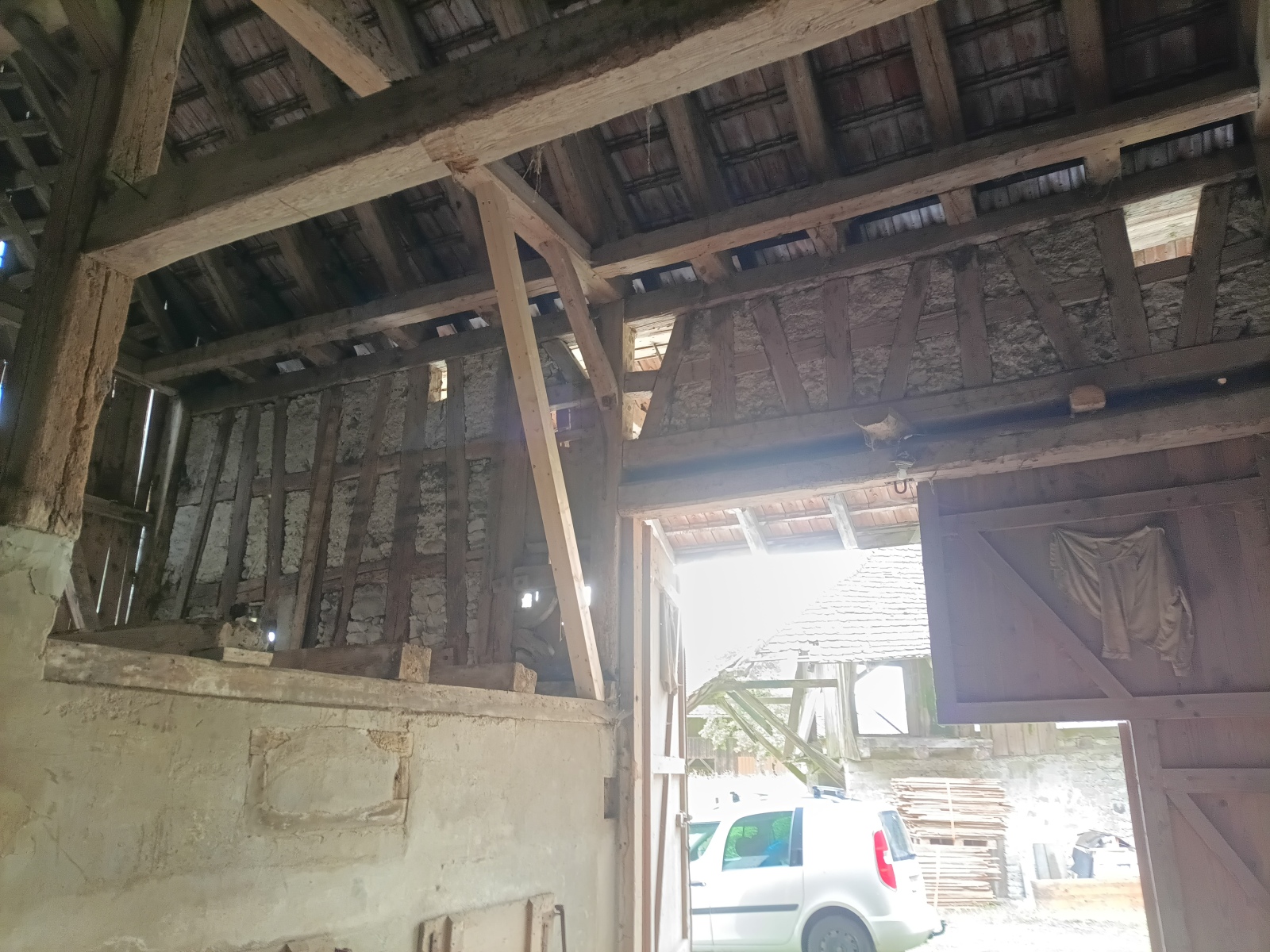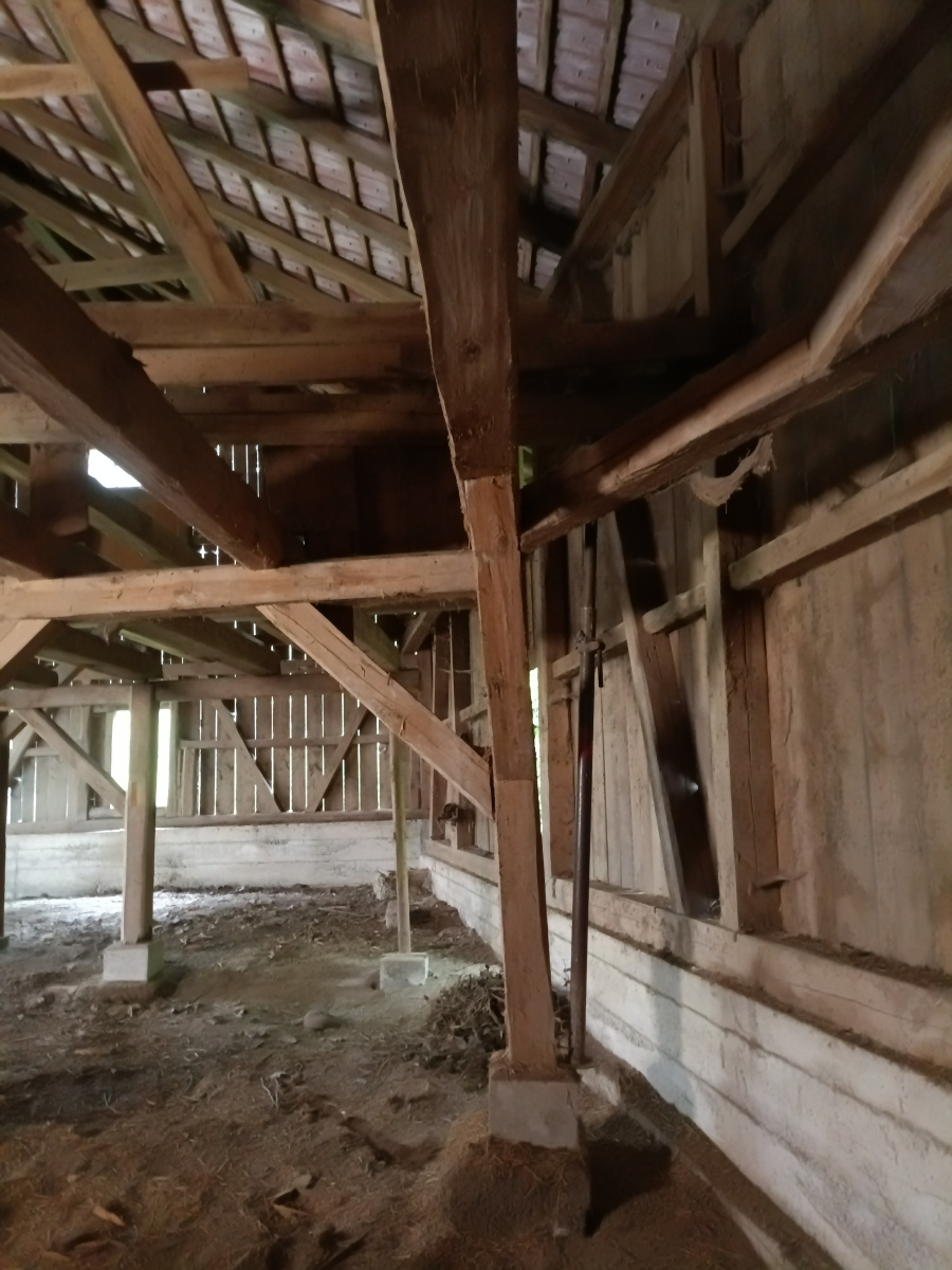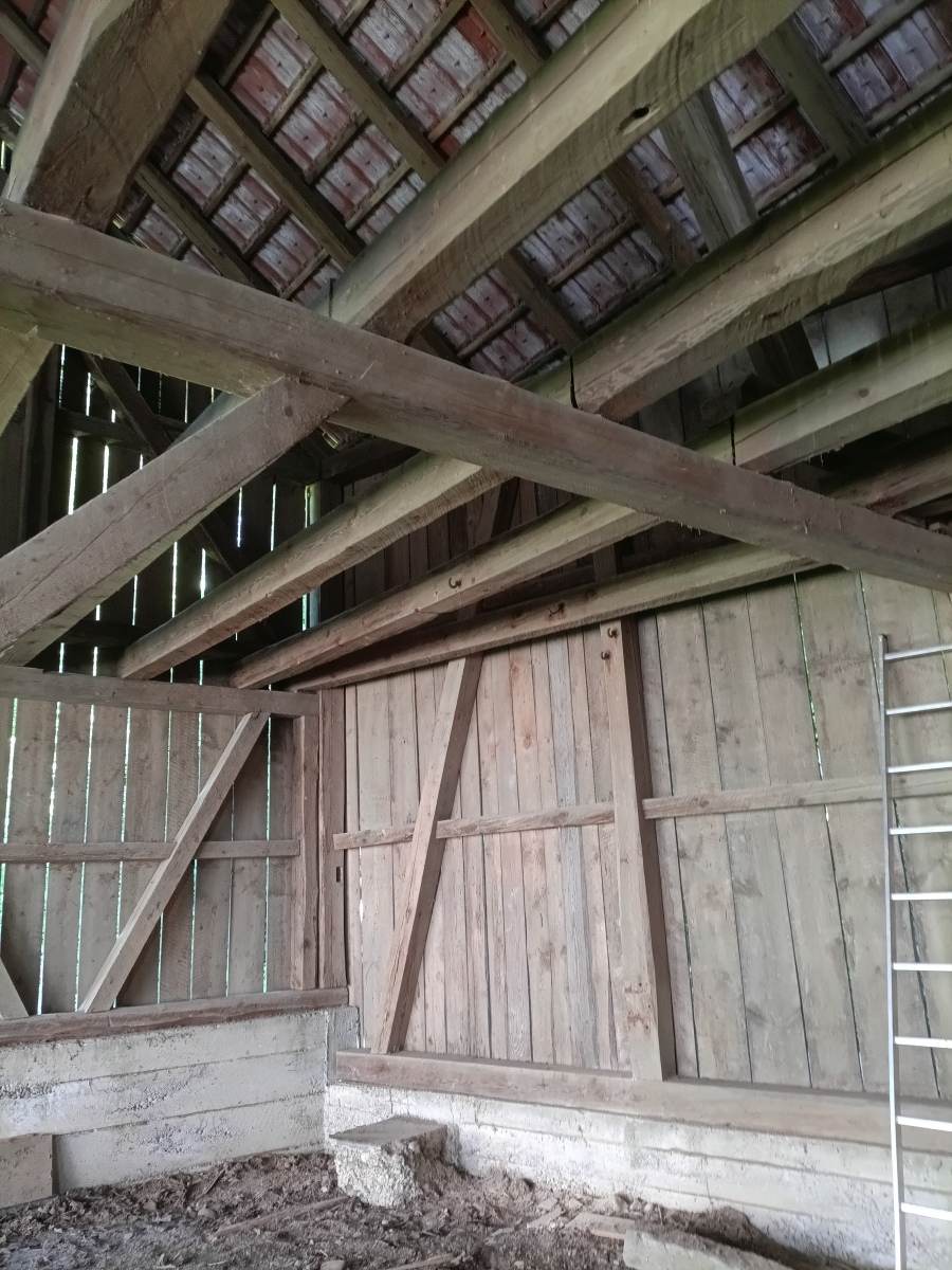 Scheune, erste Kehlbalkenkonstruktion prov. verstärkt (Träger, Spanngurt,….)