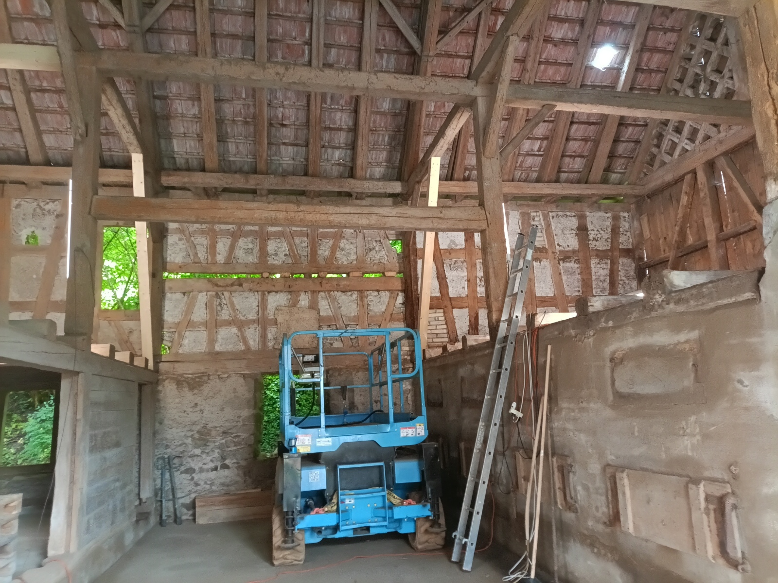 (Zu den Zimmermannsarbeiten, sollte aufgrund der von den Vorbesitzern herausgeschnittenen Tragwerks etwas am Gebäude passieren,