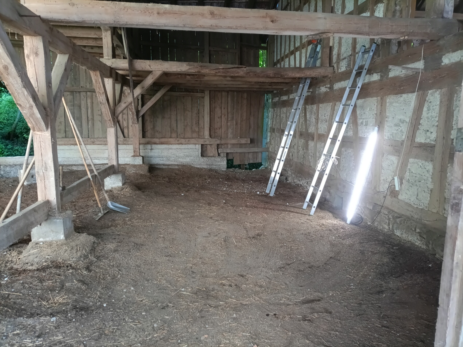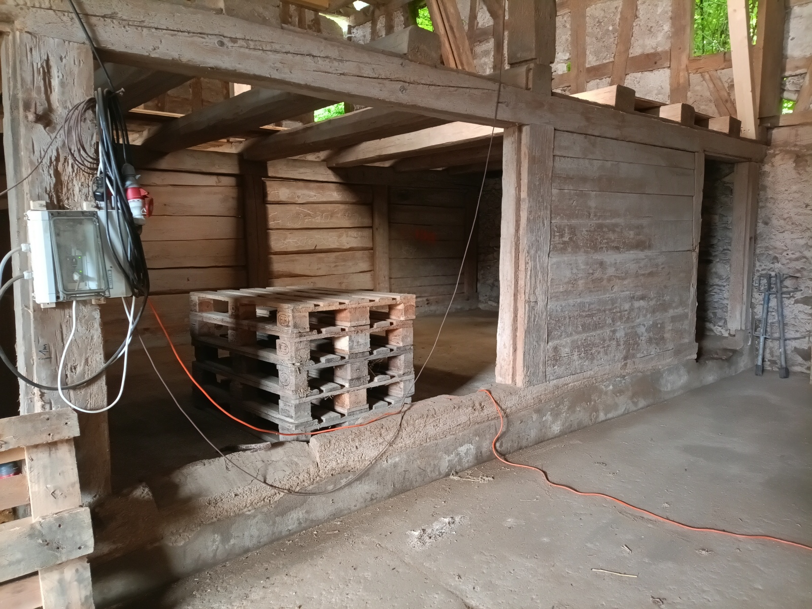 Stall rechts -> Reinigen der Balken und Seitenwände (1m). Praktisch alle Fachwerkständer sind unten durchgerotet !!!