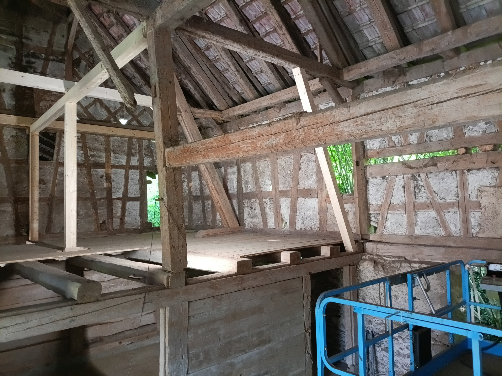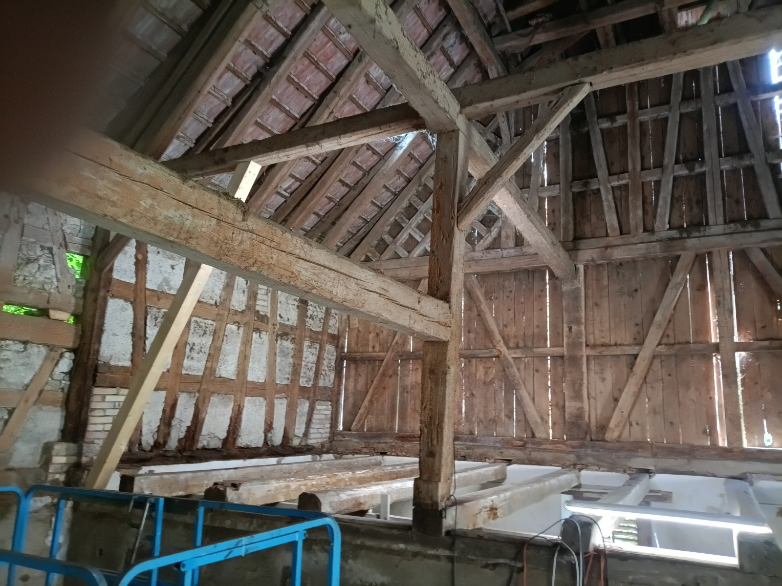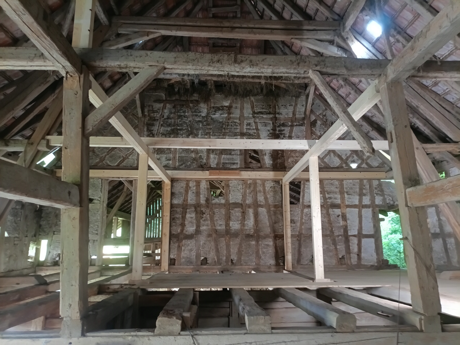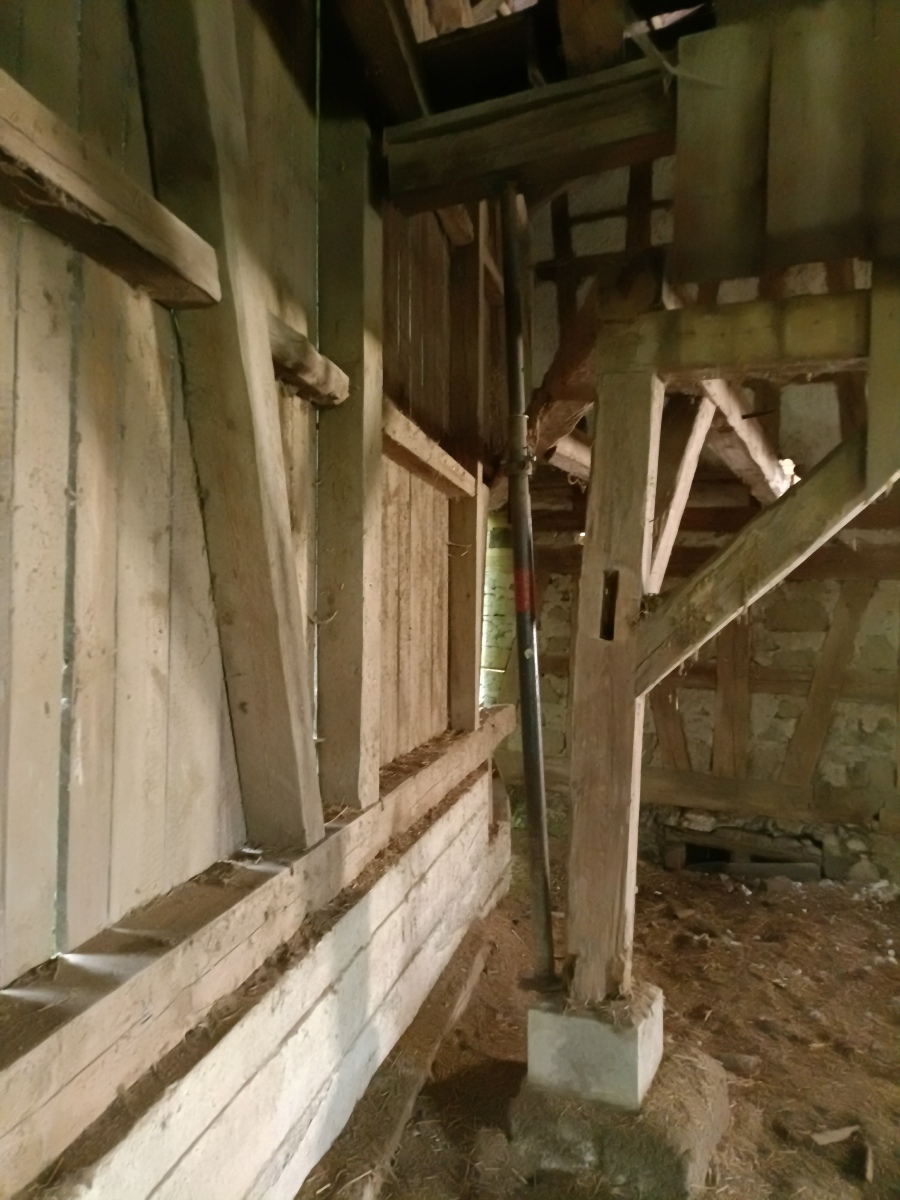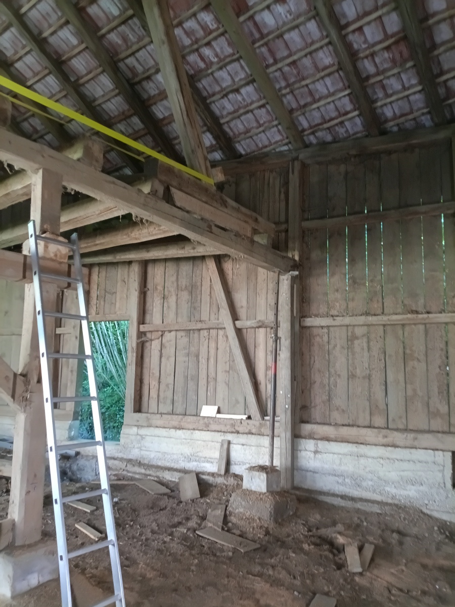 (Hier muss innen eine neue Tragwerkskonstruktion (Setzbalken und Ständer) gemacht werden um den oberen Querbalken zu stützen)