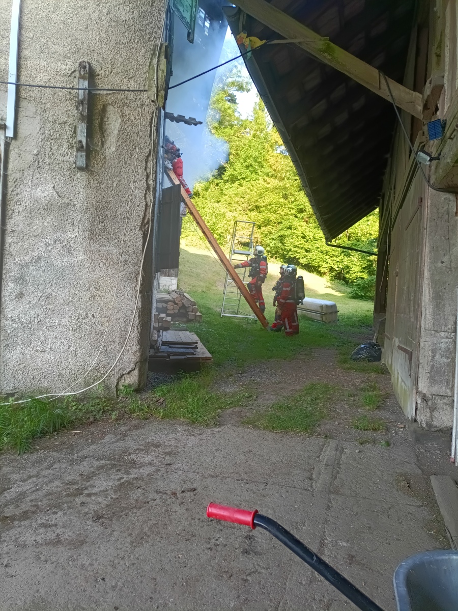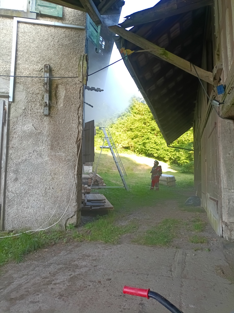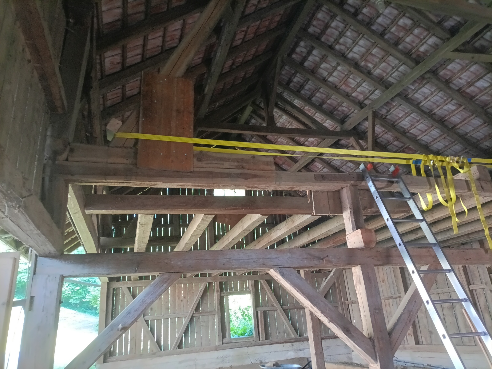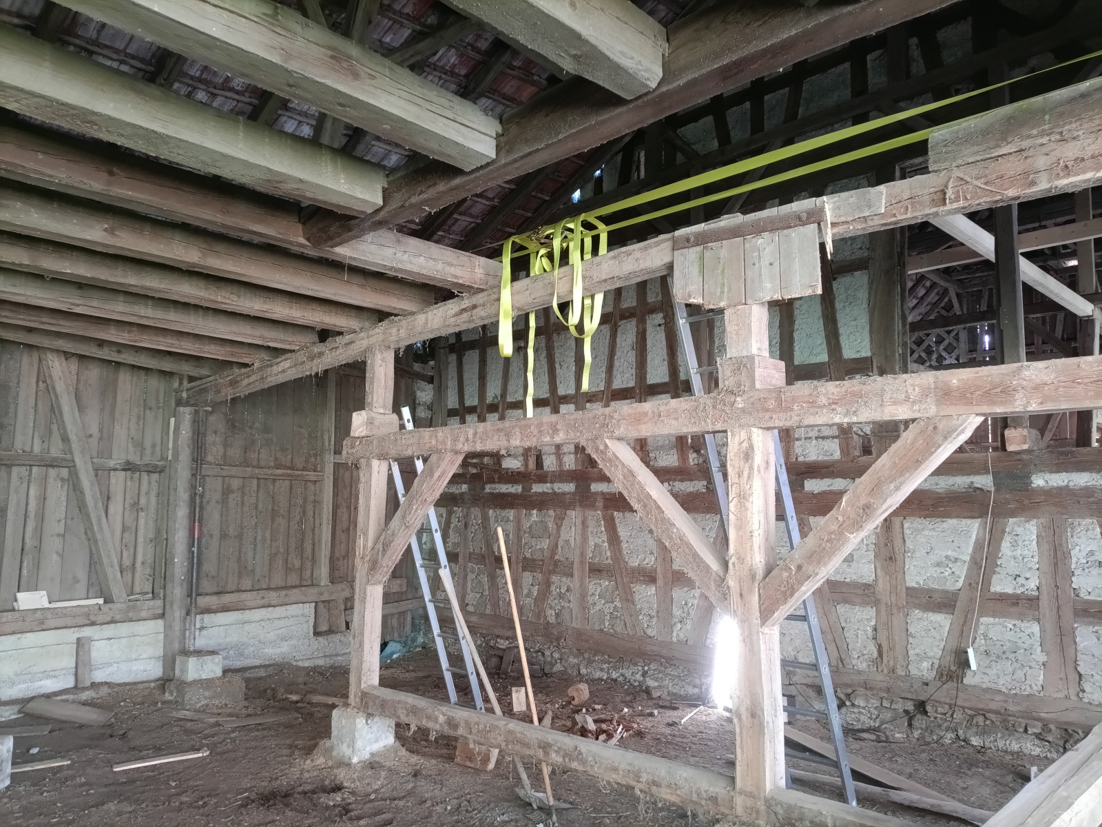 Scheune neue Schadstelle gesichtet, Querträger ohne Stütze hängt durch. prov. mit Baustütze gesichert