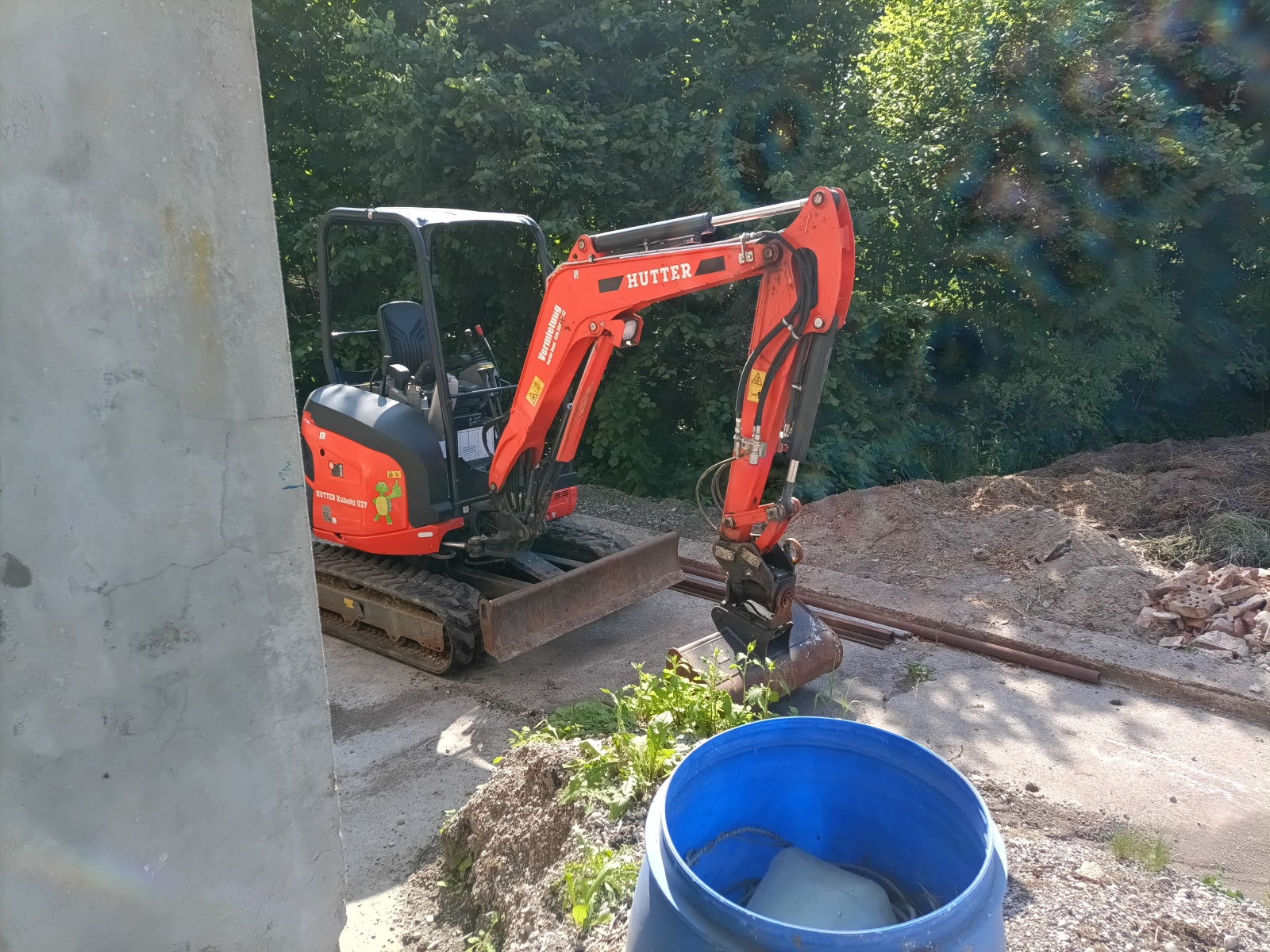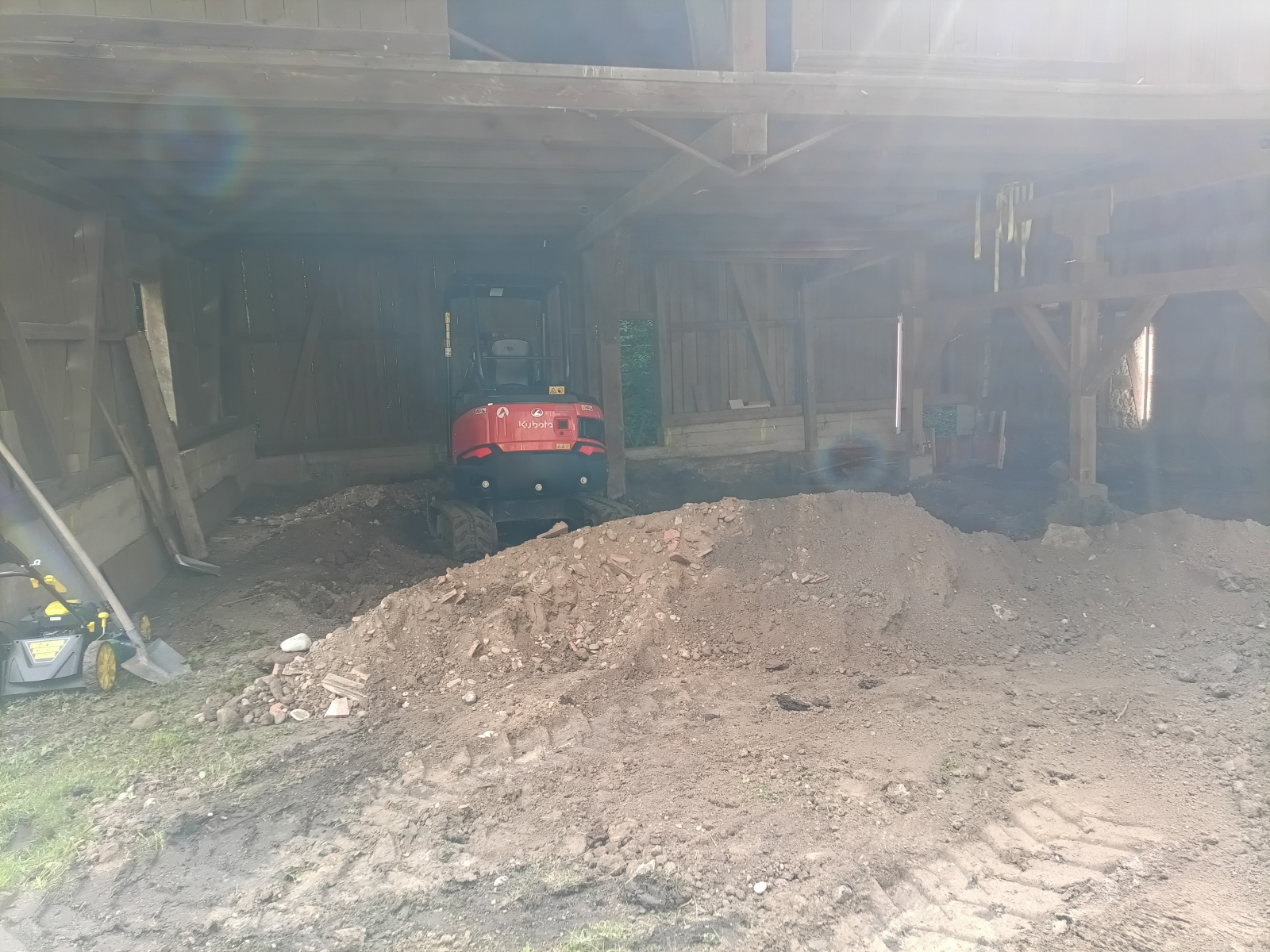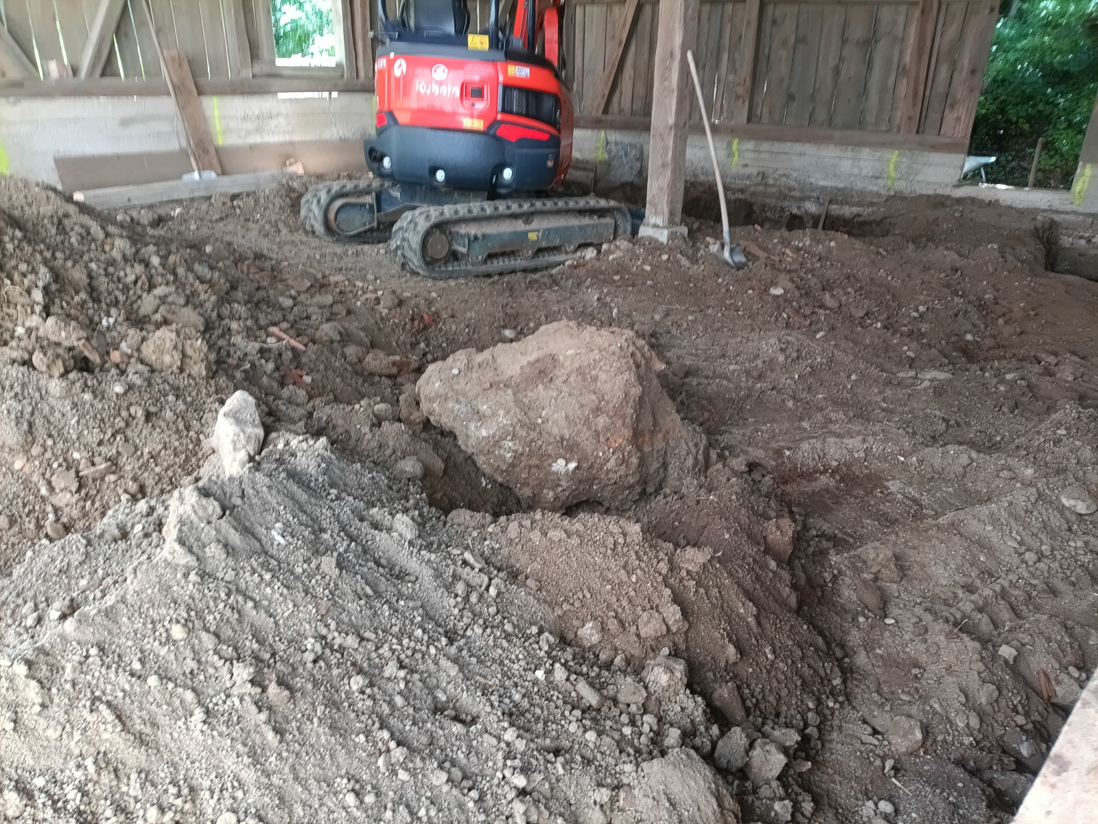 Mietbagger ist da, als Erstes zum Üben, bei Miststock, restliche Erde/Kies entfernt.