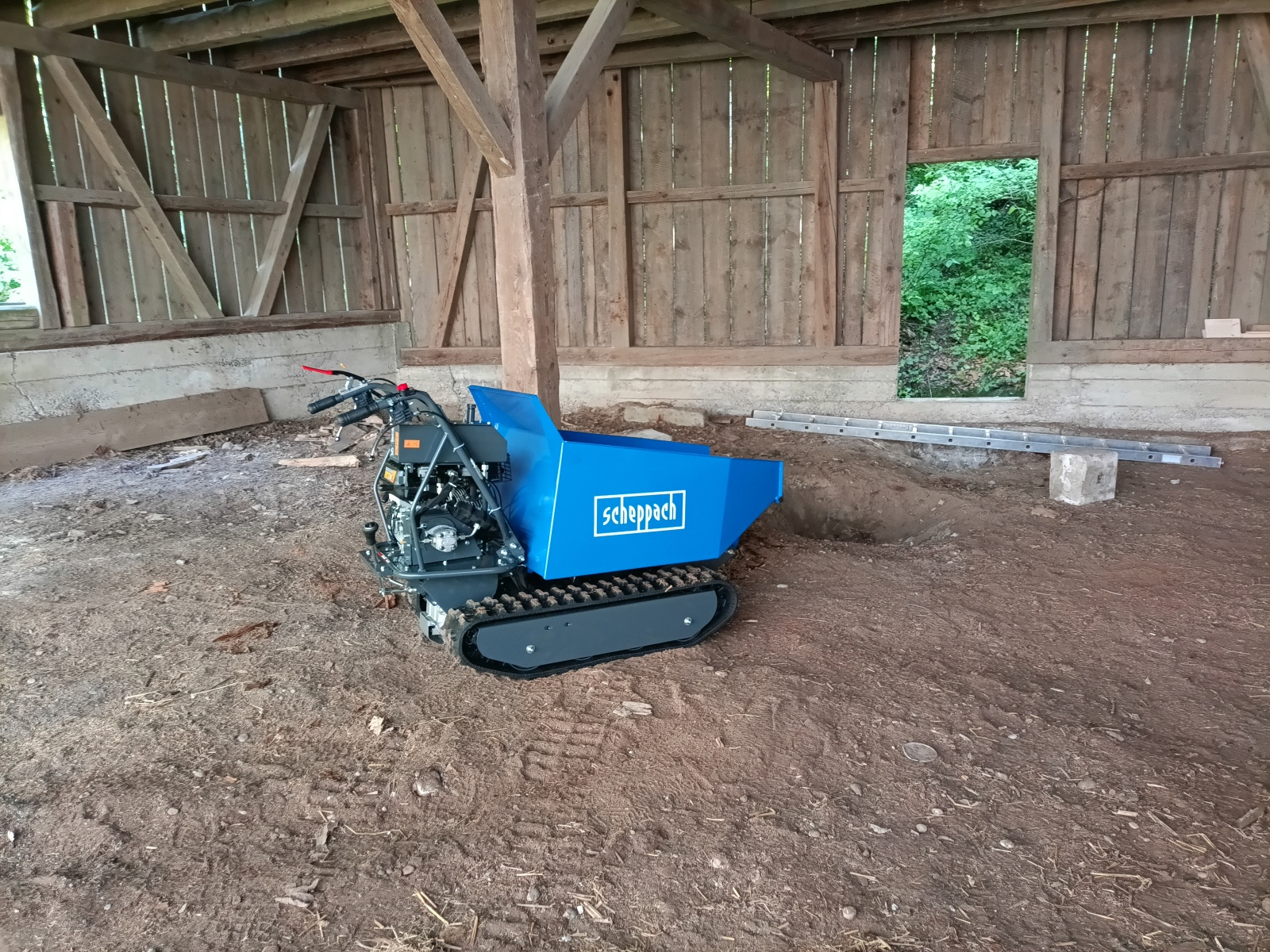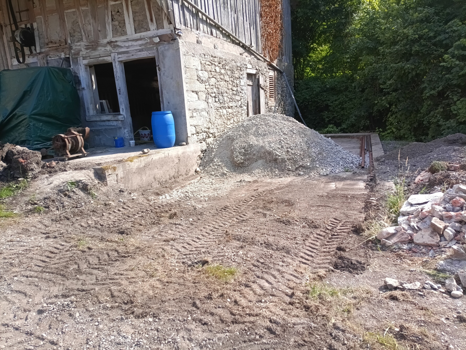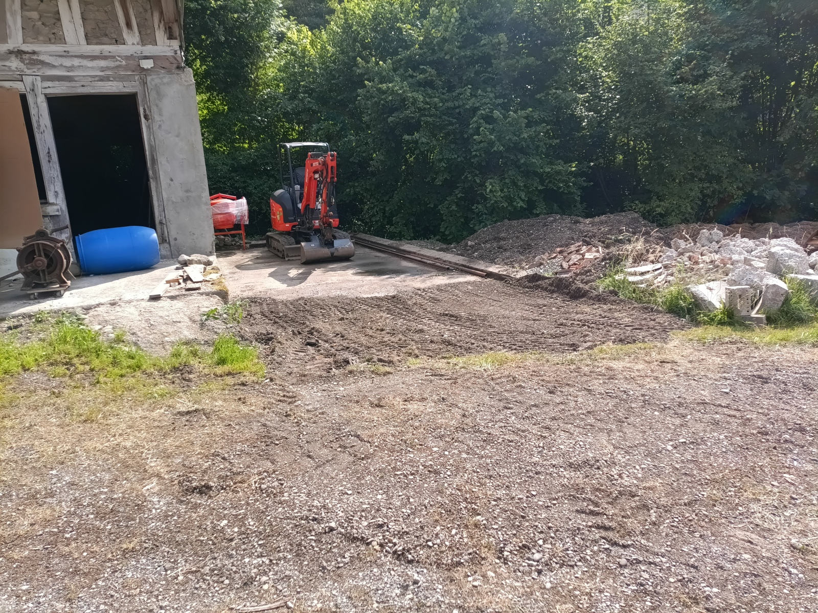 Mietbagger ist da, als Erstes zum Üben, bei Miststock, restliche Erde/Kies entfernt.