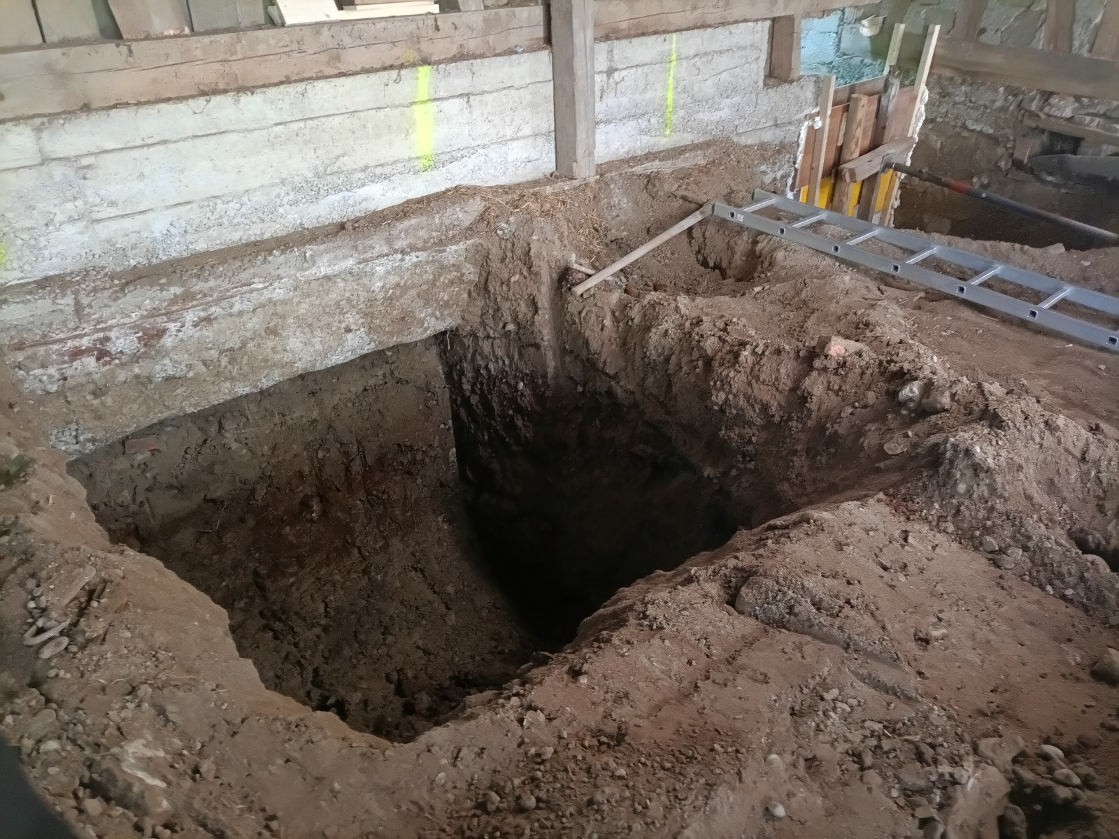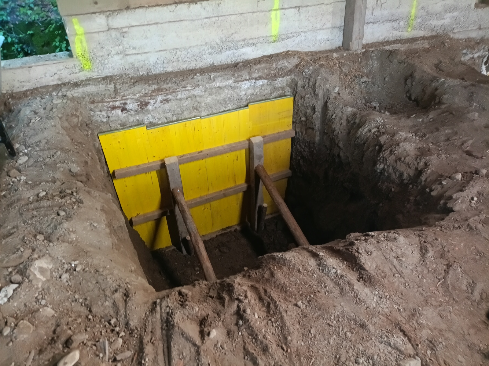 Beginn, Abdichten und Unterfangen des Schopf-Fundamentes.